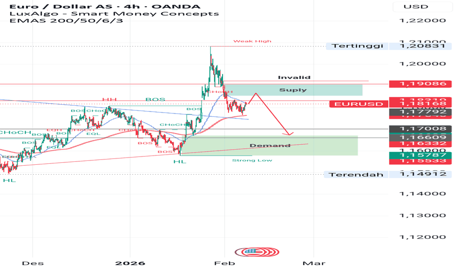 Outlook EUR/USDJika di lihat di TF 4H EUR/USD ini gagal mempertahankan higher high nya di kisaran level 1.208, ini bisa di lihat terjadi rejection kuat dari suply dan volume besar muncul saat penurunan dari high.