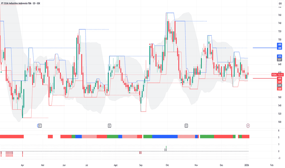 Harga saat ini berada di level 645. Secara keseluruhan, ESSA sedang berada dalam fase konsolidasi atau sideways dalam rentang yang lebar. Terlihat adanya pola Descending Triangle (segitiga menurun) yang terbentuk dari garis tren resistansi (garis putih menurun)