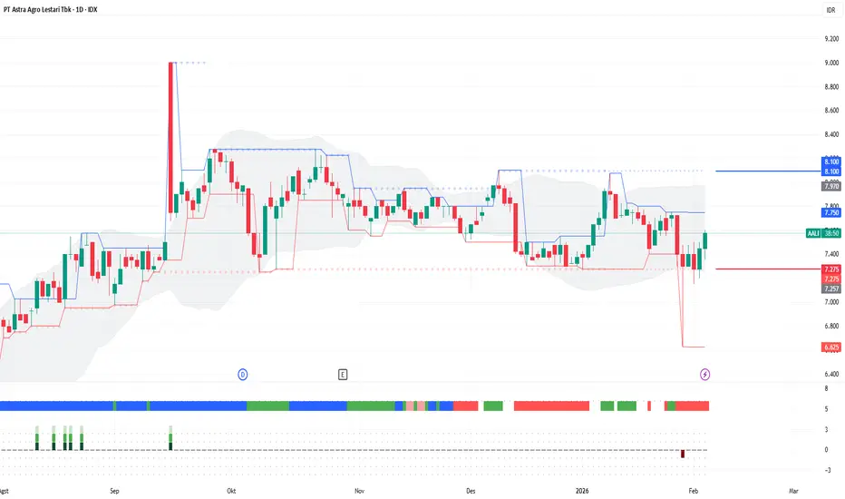 AALI saat ini sedang berkonsolidasi sehat di area swing low 7275. Selama mampu bertahan di atas area ini, masih ada potensi untuk bergerak rebound dengan target kenaikan menuju swing high 8100. Trend optimizer yang bergerak acak menunjukan saham ini berada di fase sideways.