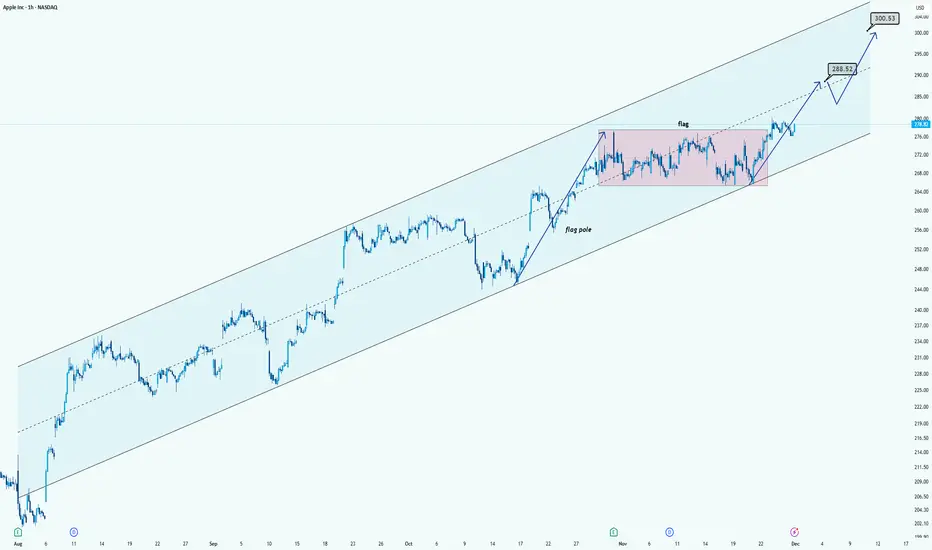 AAPL is trading inside a clean long-term ascending channel, showing a strong uptrend. Recently, the price formed a bullish flag (pink zone) after a sharp move up. The breakout above the flag signals continuation of the trend.