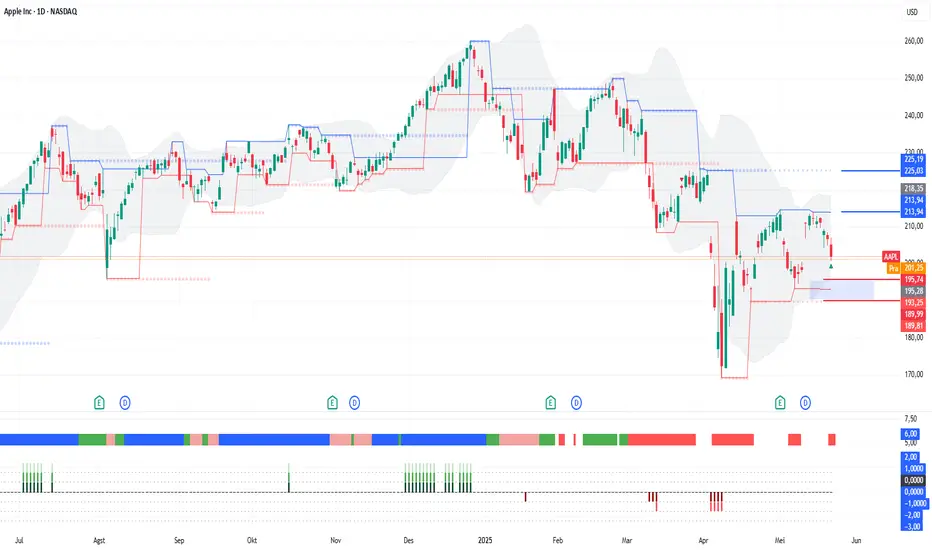 AAPL saat ini mengalami technical correction. Coba cermati area swing low di $189 - $195. Area ini menjadi area support kuat karena terdapat RS+ yang berdekatan serta berada di luar grey area. Jika AAPL berhasil mencapai area swing low kuatnya, saham ini ada peluang mengalami technical rebound dengan target kenaikan kembali ke swing high $225 dengan minor target di $213.