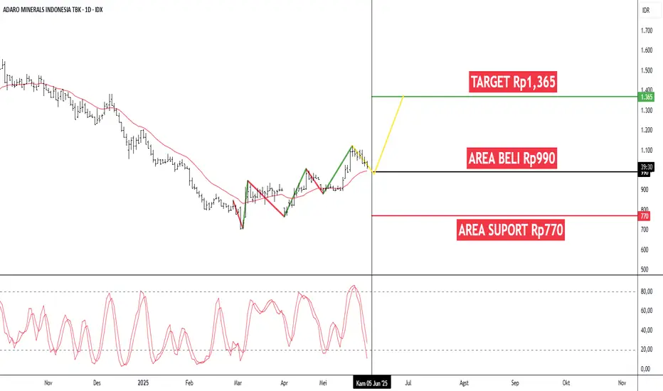 AREA BELI : Disarankan untuk melakukan pembelian, saat harga kembali ke area Rp990. Ini merupakan area kunci di mana potensi penguatan dapat terjadi.