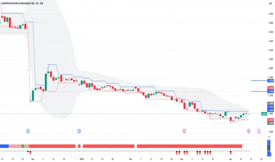 Jika ADRO mampu menembus dan berkonsolidasi sehat di atas area swing high-nya, terbuka ruang kenaikan yang lebih tinggi menuju level 2530 dengan target minor di level 2290. Trend optimizer yang berubah warna dari merah panjang ke putih menandakan sedang berada dalam fase bottom reversal.