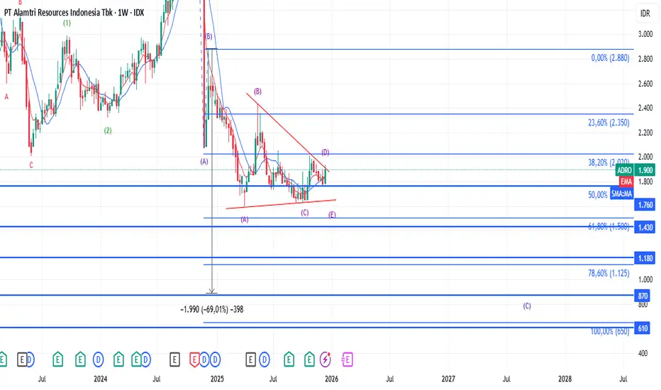 Melihat weekly chart ADRO, big wave nya masih berada di wave c, namun disini terbentuk pola triangle wave dimana sudah mencapai wave D dan berpeluang terjadi koreksi ke wave E.