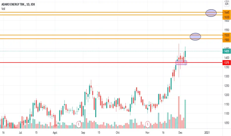ADRO terlihat mengalami rejection dari support gap di area 1385-1360 dan support horizontal di harga 1375. Pada perdagangan selanjutnya ADRO berpotensi melanjutkan penguatan menuju level harga di atas 1500 untuk jangka pendek. BUY saat breakout 1460 di harga 1465 dengan proteksi di harga 1355.