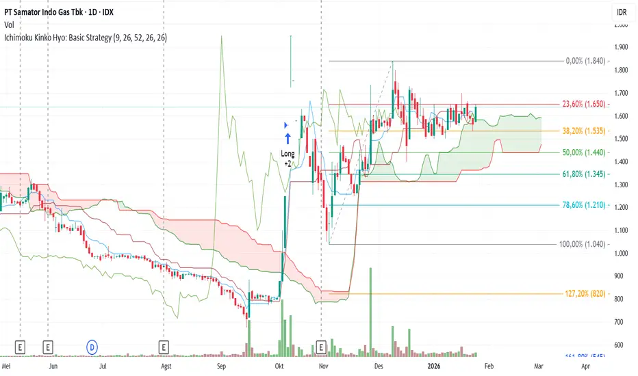Dari perspektif awan, harga berada di atas Current Kumo yang relatif tebal, sehingga zona 1.580–1.415 berfungsi sebagai bantalan support dinamis yang kuat jika terjadi pullback. Future Kumo yang bullish dan menipis mengindikasikan kelanjutan tren masih terbuka, meski volatilitas berpotensi meningkat. Dalam konteks Fibonacci, area 1.650–1.675 menjadi resistance terdekat yang krusial; penembusan bersih di atas level ini akan membuka ruang menuju 1.840. Strategi yang lebih terukur adalah mengikuti tren dengan pendekatan buy on weakness selama harga bertahan di atas Kijun Sen, sambil menempatkan disiplin risiko di bawah area 1.560 untuk menjaga rasio risk–reward tetap optimal dalam struktur bullish yang sedang berkembang.