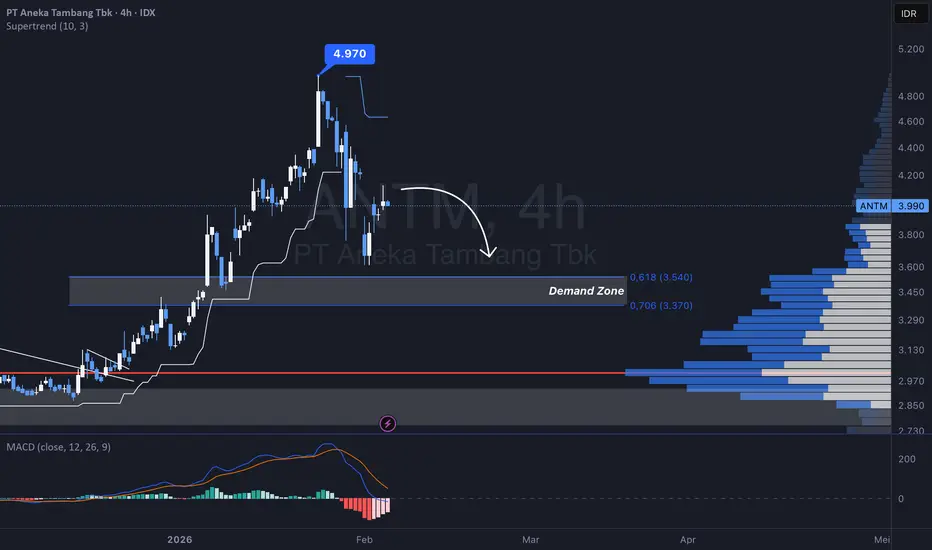 Berdasarkan chart 4 jam (4h) PT Aneka Tambang Tbk (ANTM) yang Anda lampirkan, berikut adalah interpretasi dan analisis teknikalnya secara mendalam: