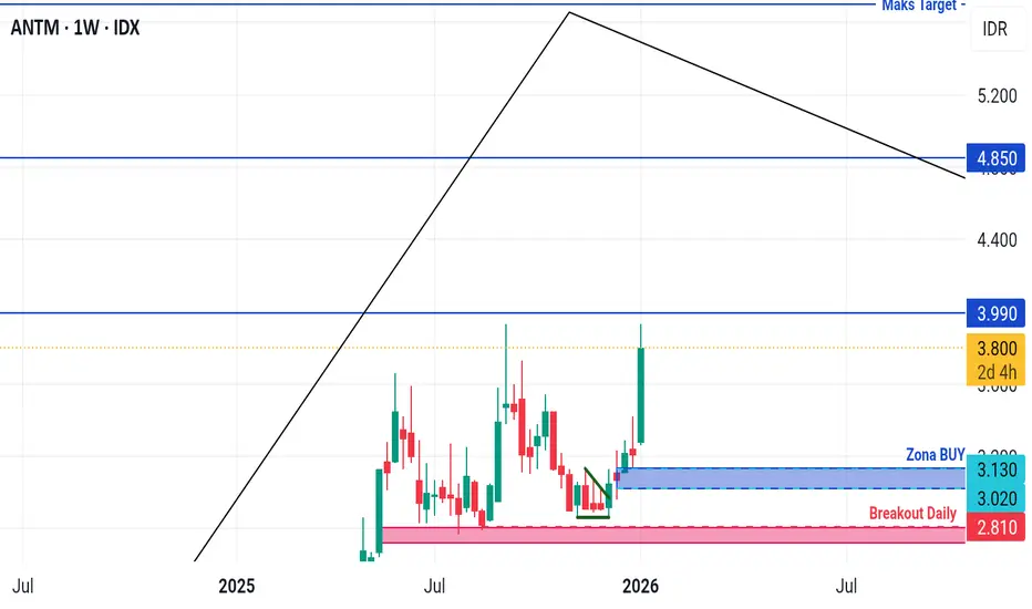 Antam hampir mencapai target pertama 3990, harap perhatikan level yang harus dijaga agar tetap bullish yaitu 3520, selama harga bergerak diatas 3520 potensi besar mencapai target terjauh.