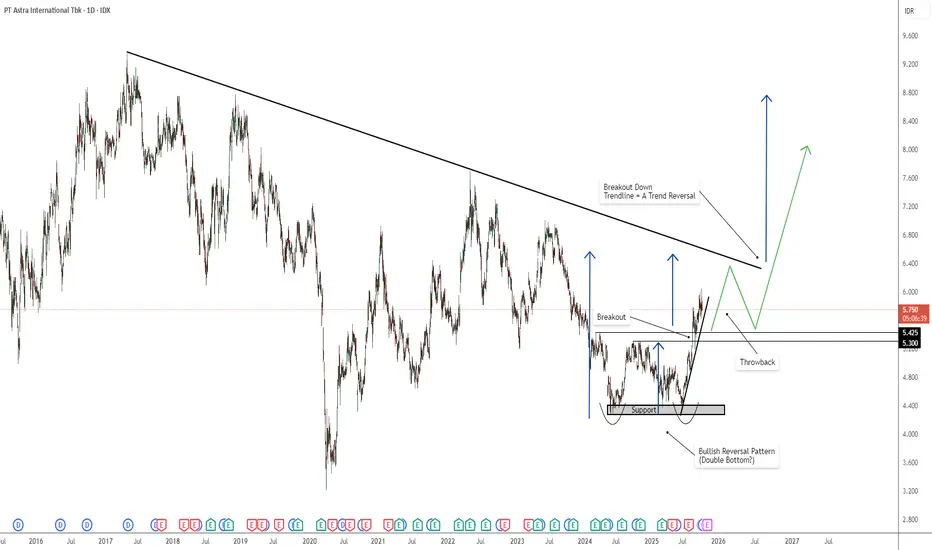 Sejak awal 2024, ASII membentuk Bullish Reversal Pattern (Double Bottom?) untuk membalikkan Downtrend dari sejak Juli 2023. Pola tersebut baru terkonfirmasi dengan Breakout di area Rp5,300 - Rp5,425 di September 2025.