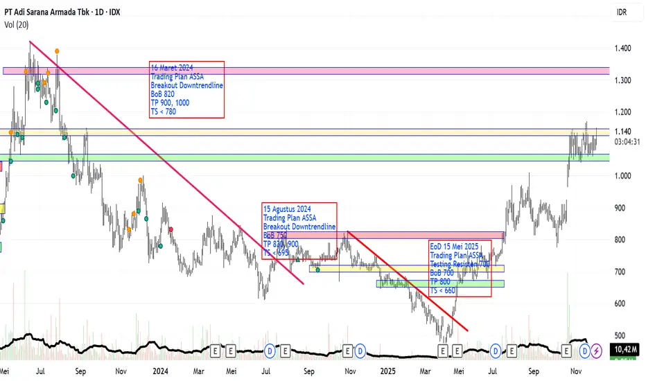 Saham ASSA terlihat sedang melakukan testing resisten area kuning sekitar 1150, jika bisa berlanjut maka akan naik lagi ke area merah sekitar 1325. Jika tidak berhasil, maka akan turun ke area hijau sekitar 1050.