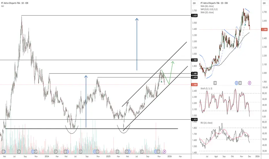 Penurunan dari sejak Rp2,700 di awal November 2025 pun terindikasi sebagai Technical Correction (dengan batas maksimum di Rp2,400an atau Support dari Uptrend Channel tersebut).