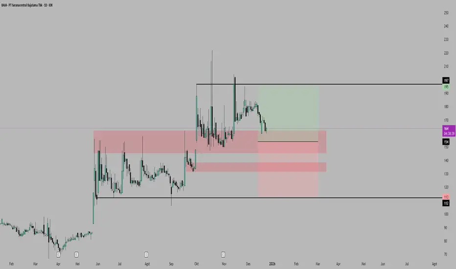 Jika harga bertahan di atas 150โ155, potensi reversal/pullback to the upside menuju 180โ197.