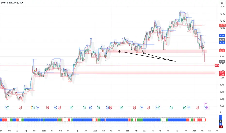 BBCA gagal bertahan di atas area swing low 8600 dan terus bergerak turun dalam fase strong downtrend. Swing low yang ditembus kebawah akan berubah peran menjadi area swing high. Selama BBCA tidak mampu kembali dan bertahan di atas area 8600, saham ini masih berpeluang untuk bergerak turun lebih dalam menuju 7400 - 7525.