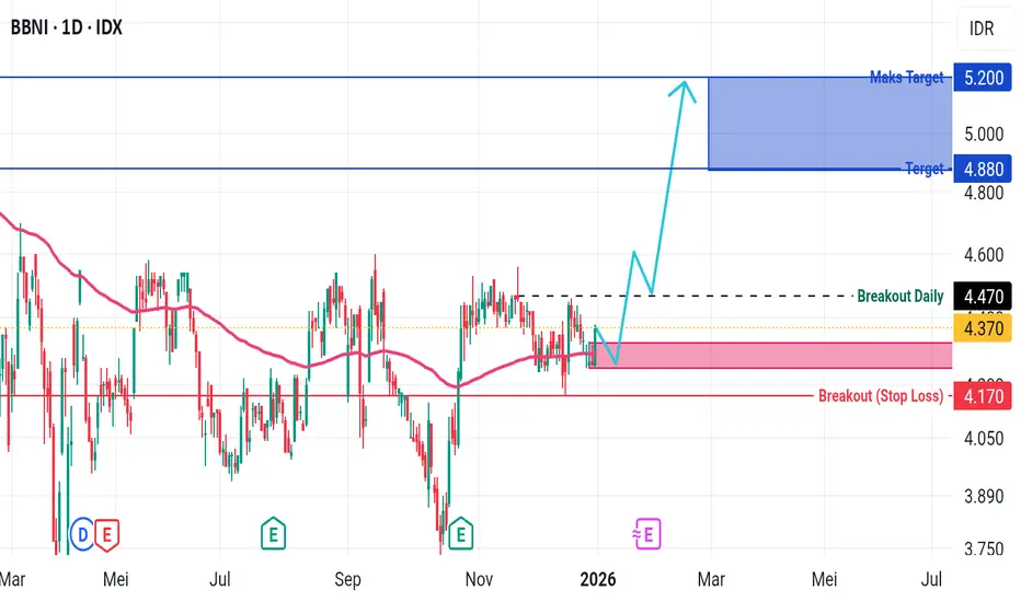 Perlu dicatat penguatan berkelanjutan dapat terjadi apabila BBNI mampu "Breakout Daily" (4470), disisi lain jika "Breakout Daily" (4170) mampu ditembus maka BBNI dapat dipastikan drop mengejar zona Rally Base Rally (4000-4100).