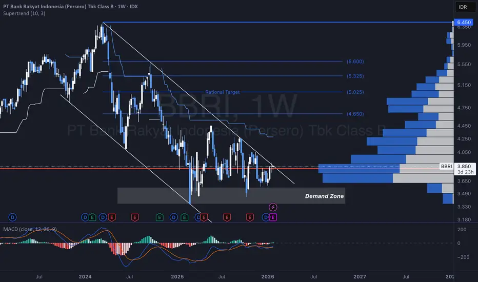 • Skenario Optimis: Breakout dari garis tren putih akan membawa BBRI menuju 4.650 dalam jangka menengah.