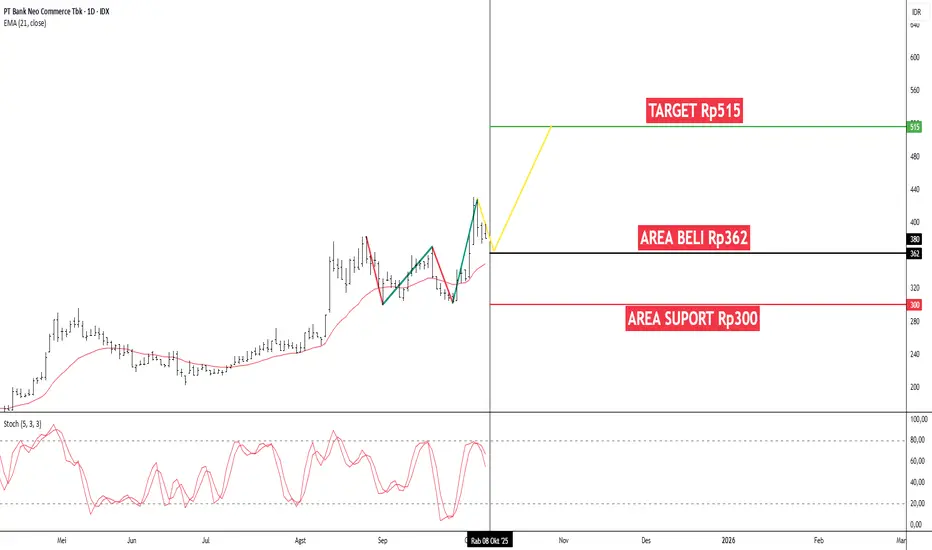 AREA BELI: Disarankan untuk melakukan pembelian, saat harga kembali ke area Rp362. Area ini merupakan area kunci di mana potensi penguatan dapat terjadi.