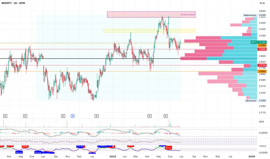 Wracamy z szybką analizą i aktualizacją spółki Benefit. W ostatniej analizie pisałem o strefie podaży, która po wybiciu ATH powinna zareagować i przynieść korektę. Był to poziom 3500-3600 zł za akcję (załączam link w powiązanych). Tak też się stało i kurs dwukrotnie dotarł do tego poziomu, a następnie rozpoczął spadki ściągając cenę w dół nawet o 16%. Obecnie kurs konsoliduje w zakresie 2995 - 3150 zł.