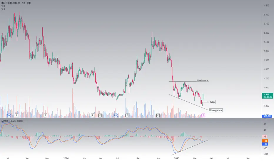 BIRD mulai menunjukkan tanda-tanda bangkit dari tidur panjangnya di tengah tren turun yang masih kuat. Terlihat ada bullish divergence di indikator MACD—harga makin turun, tapi MACD justru naik. Ini bisa jadi sinyal jika tekanan jual mulai melemah.