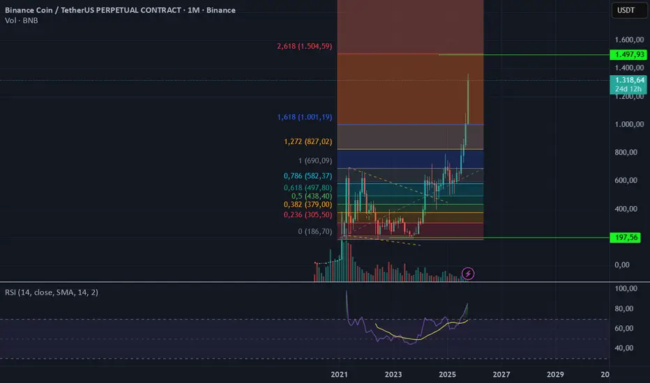 BNBUSD saat ini sudah break ATH, namun jika diukur dengan fibo, kenaikkan kemungkinan akan terus sampai 1500$,disini kita harus hati-hati terjadinya koreksi besar