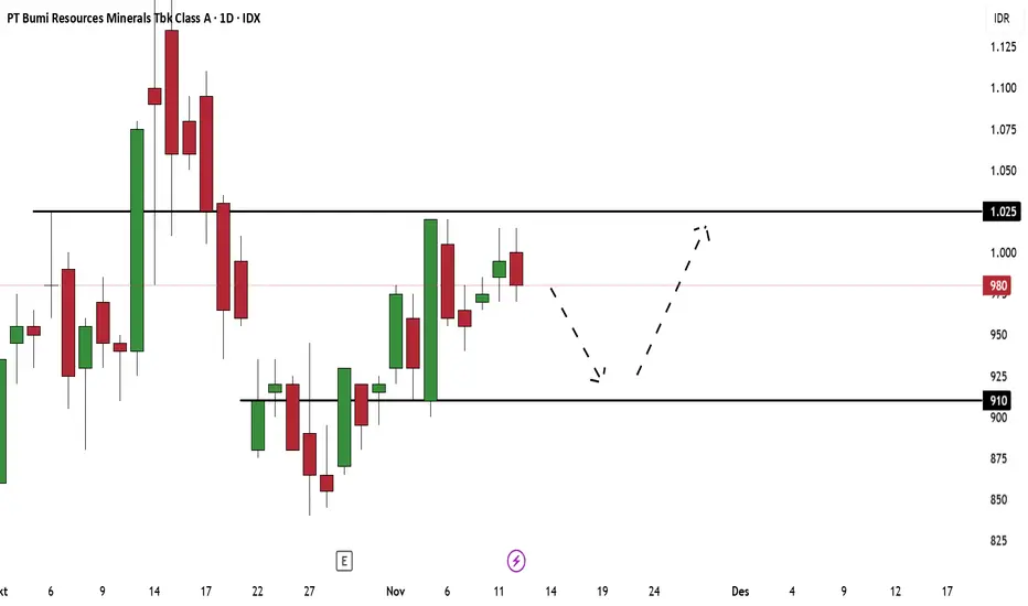 BRMS berpotensi sideways di range support 910 dan resisten 1025. Kunci : Beli jika di area support atau beli jika sudah break resisten