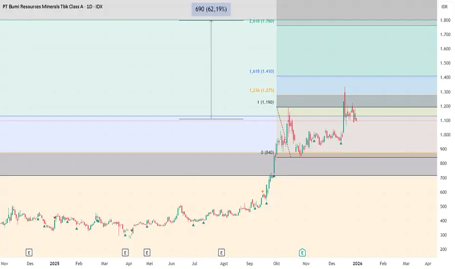 Dari berbagai point of view, BRMS ini sudah mencapai harga optimal teknikalnya (harga optimal pasar bisa berbeda). Harga tersebut ada di kisaran 1130 - 1140, dan 1280. No wonder saham ini mulai alot. Terlepas dari harga ARA di bulan Desember, namun technically harga sudah optimal. Ada 1 point of view yang masih membuka ruang bullish, yakni break all time high pasca IPO 715. Dari ini terdapat target kenaikan menuju 1800, namun tampaknya harga sekarang harus bisa bertahan di level 1300 ke atas.