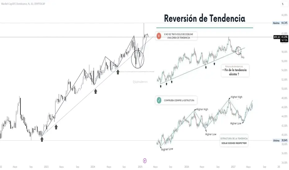 Ejemplo educativo: He utilizado la dominancia de Bitcoin ya que por las redes se habla de que empieza la reversión de la tendencia de la dominancia de Bitcoin. Todavía no ha marcado un mínimo más bajo en temporalidades mayores así que aún no hay confirmaciones claras. Sin embargo, puede que nos estemos acercando cada vez más a ese momento. Por eso es importante conocer y saber esto.