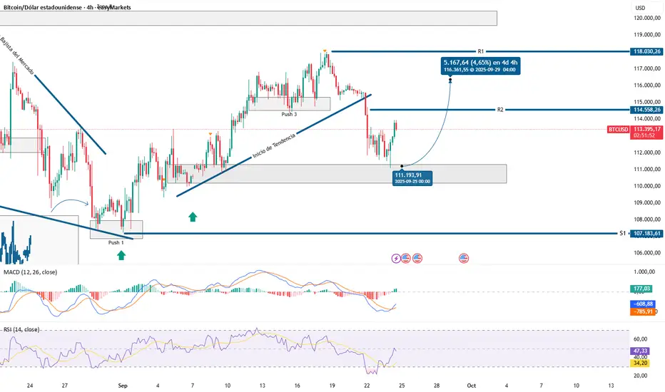Las operaciones sobre BTCUSD parecen estar retomando fuerza, luego de que el precio rebotara con claridad en el soporte ubicado en los 111,400 dólares. Este comportamiento podría abrir la puerta a un movimiento alcista con destino hacia la Resistencia 2, un recorrido que, dada la proximidad entre niveles, podría completarse en las próximas horas.