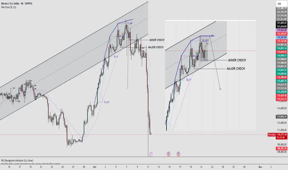 As marked in the previous analysis (shown on the right), BTC/USD respected the channel structure and delivered the expected downside move after confirming both Minor and Major CHoCH (Change of Character) levels.