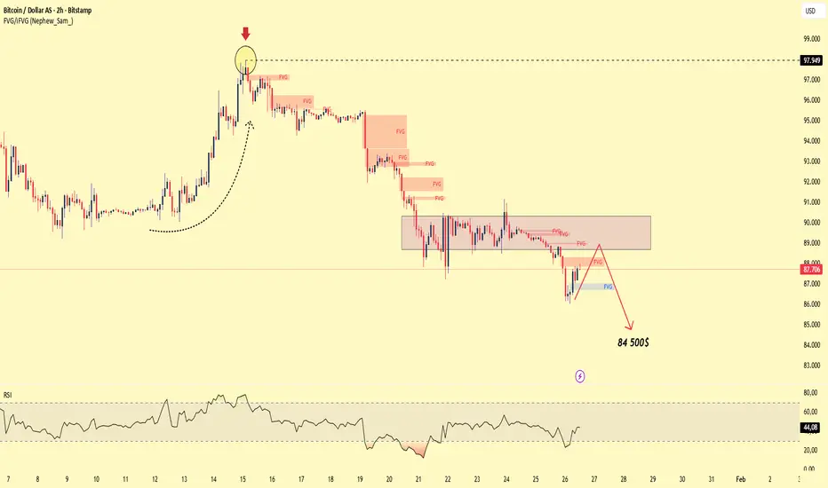 Setelah mencapai puncak dan mengalami penolakan kuat, BTC telah beralih ke struktur bearish yang jelas, dengan reli berulang kali terhambat di zona FVG atas.