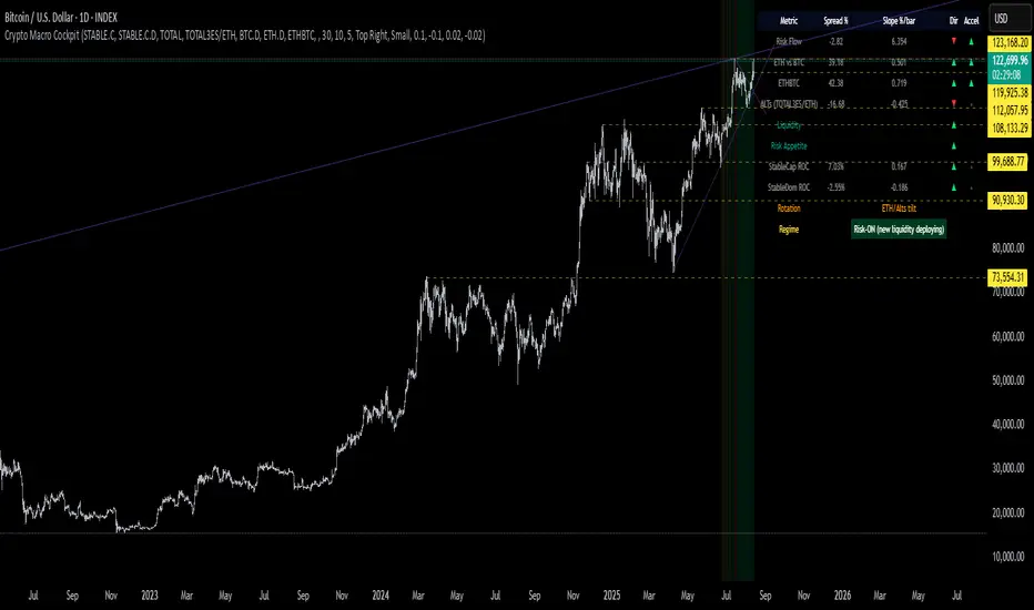 This chart presents a live macro overlay for crypto markets using the new Crypto Macro Cockpit, a Pine Script-based dashboard that blends traditional flow metrics with institutional-era proxies.