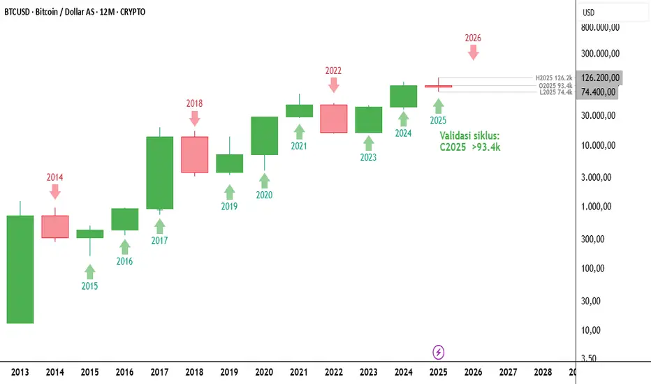 Grafik BTCUSD pada timeframe tahunan (12-Month) ini memperlihatkan struktur pergerakan harga yang sangat disiplin mengikuti 4-year cycle (siklus empat tahunan). Jika kita perhatikan sejarah price action yang ditandai dengan panah hijau dan merah, Bitcoin cenderung mengalami tiga tahun bullish yang diikuti oleh satu tahun koreksi tajam (bearish). Pola ini terlihat jelas pada periode 2014, 2018, dan 2022 sebagai tahun-tahun koreksi setelah mencapai puncak siklusnya.