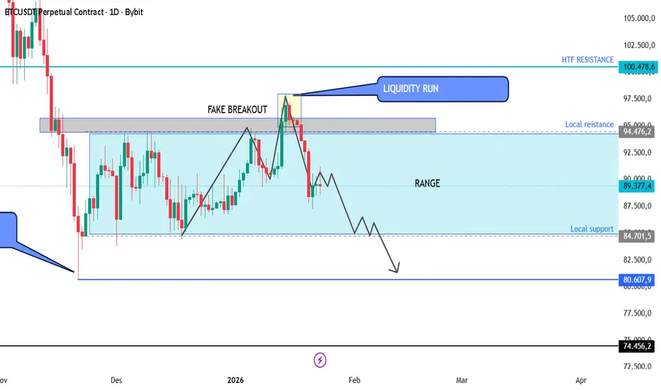4. Strategi yang disarankan: Short/sell di dalam range pas harga balik ke high setelah liquidity run, jangan buru-buru long di breakout palsu (seperti jebakan WAVE B). Tunggu konfirmasi reversal dari sweep Low (zona $80k-83k), baru long kalau harga recover local low dan balik ke dalam range menuju high, Pantau volume liquidation di low + RSI buat sinyal bottom.