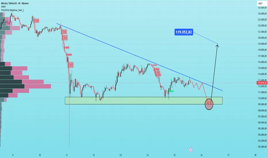 Setelah terkoreksi dari area 118,000, harga BTC berfluktuasi dalam kisaran sempit di sekitar 112,500. Struktur pasar pada frame 45 menit menunjukkan bahwa downtrend dalam jangka pendek masih dominan, namun area support 110,000 - 111,000 telah diuji berkali-kali dan telah terjadi reaksi harga yang kuat, jelas menunjukkan potensi tekanan beli.
