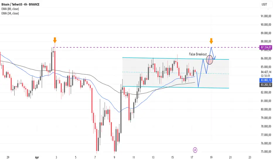 BTCUSDT saat ini bergerak dalam pola konsolidasi mendatar. Baru-baru ini, harga menembus area resistance di sekitar 87.194 USDT namun segera tertolak kembali ke bawah, membentuk sinyal false breakout – sebuah indikasi klasik bahwa potensi penurunan bisa terjadi dalam waktu dekat.
