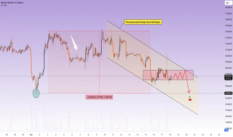 BTC masih bergerak dalam saluran menurun yang jelas. Penurunan berulang ditolak di garis tren atas → titik tertinggi yang lebih rendah dipertahankan, mengkonfirmasi bahwa tren penurunan belum berakhir.
