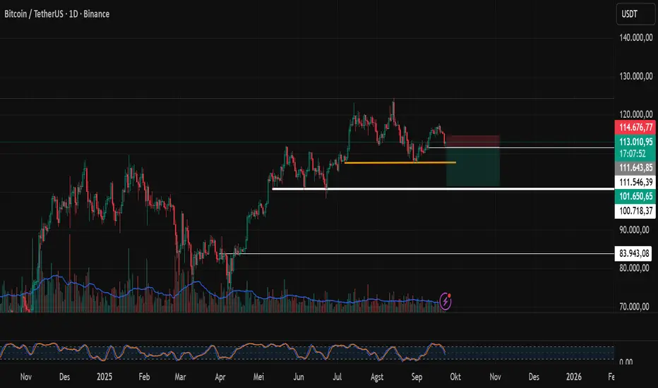 Target take-profit bertahap: TP1 = 116k, TP2 = 122k (atas resistance).