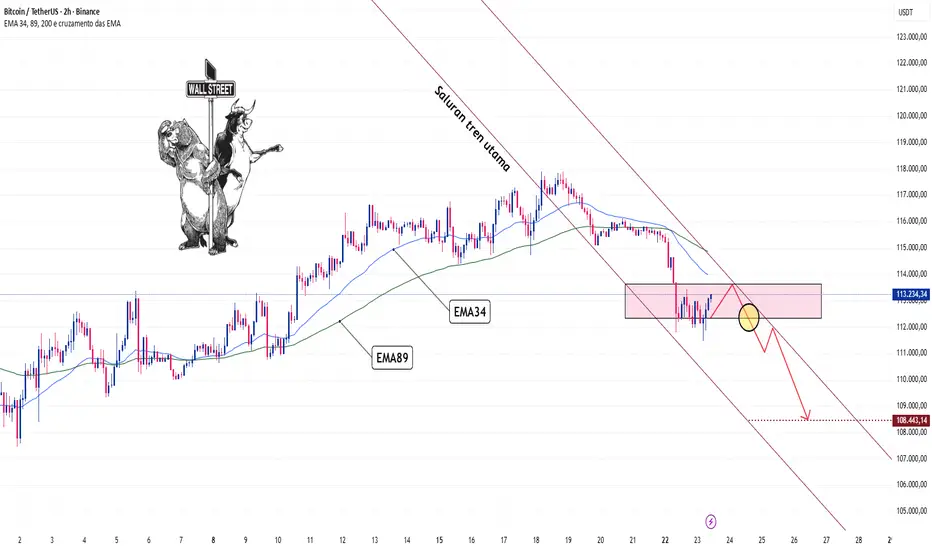 Bitcoin diperdagangkan di sekitar 113,1 ribu, setelah sedikit pulih secara teknis dari titik terendah baru-baru ini, tetapi masih sepenuhnya berada di dalam kanal turun utama. Pada grafik 2 jam, harga masih terblokir oleh klaster EMA34/89 dan area resistensi 112,5 ribu - 114 ribu, menunjukkan bahwa tekanan jual masih mendominasi.