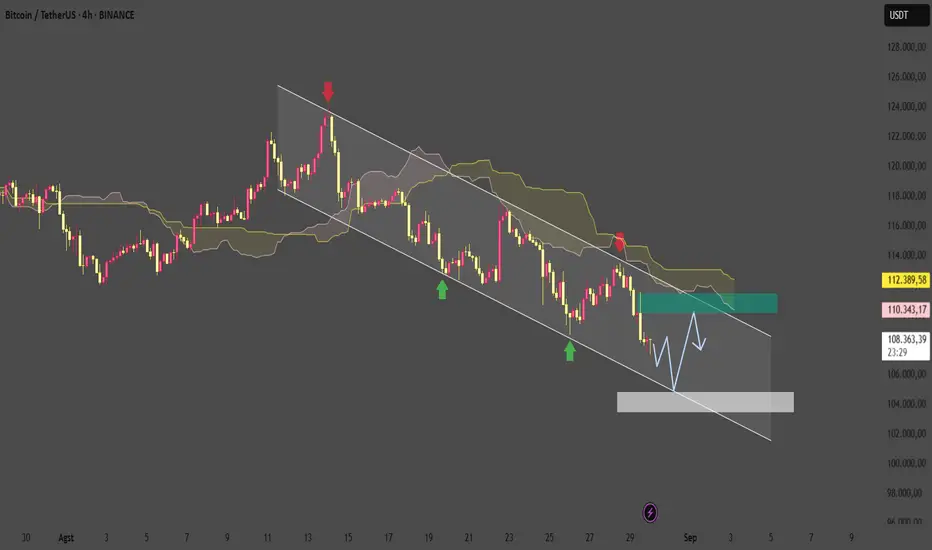 Pada grafik 4H, BTC bergerak dalam channel bearish. Harga terus tertahan di trendline resistance dan berada di bawah awan Ichimoku → tren utama tetap bearish.
