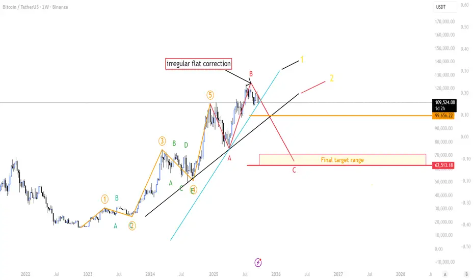 I’m sharing a possible irregular flat correction that could pull BTC toward ~62,513—only if two key trend supports break.