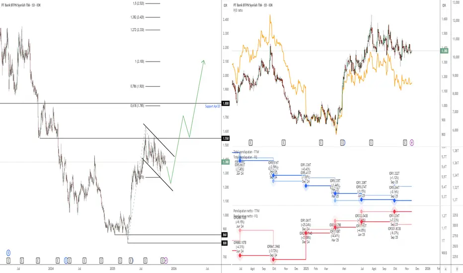Penurunan harga saham BTPS sejak Juli 2025 terindikasi sebagai Bullish Continuation Pattern (Bullish Flag?) dengan potensi Uptrend menuju Rp2,100 (menggunakan Fibonacci Projection). Trigger utama adalah Breakout Resistance disekitar Rp1,450. Support yang perlu diawasi adalah Rp1,270 karena berpotensi membatalkan Uptrend apabila terjadi Downtrend.
