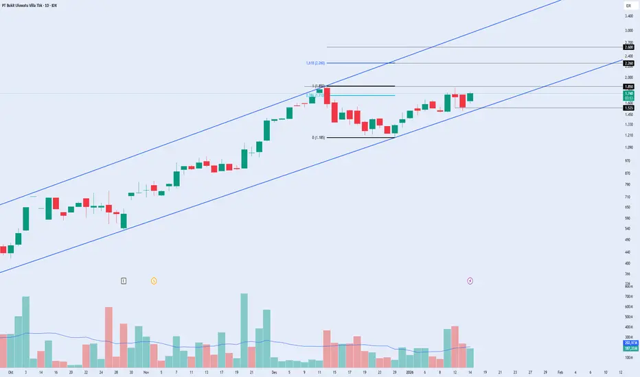 BUVA masih bergerak di dalam ascending channel, mencerminkan tren naik menengah yang tetap terjaga. Setelah reli sebelumnya, harga saat ini berada pada fase konsolidasi sehat dengan struktur higher low yang masih valid.