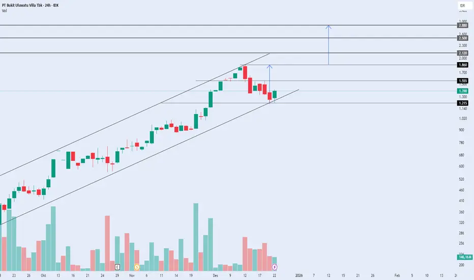 Namun, apabila terjadi pullback, area Rp 1.300 – Rp 1.215 menjadi zona pertahanan yang perlu dijaga agar struktur uptrend tetap valid.