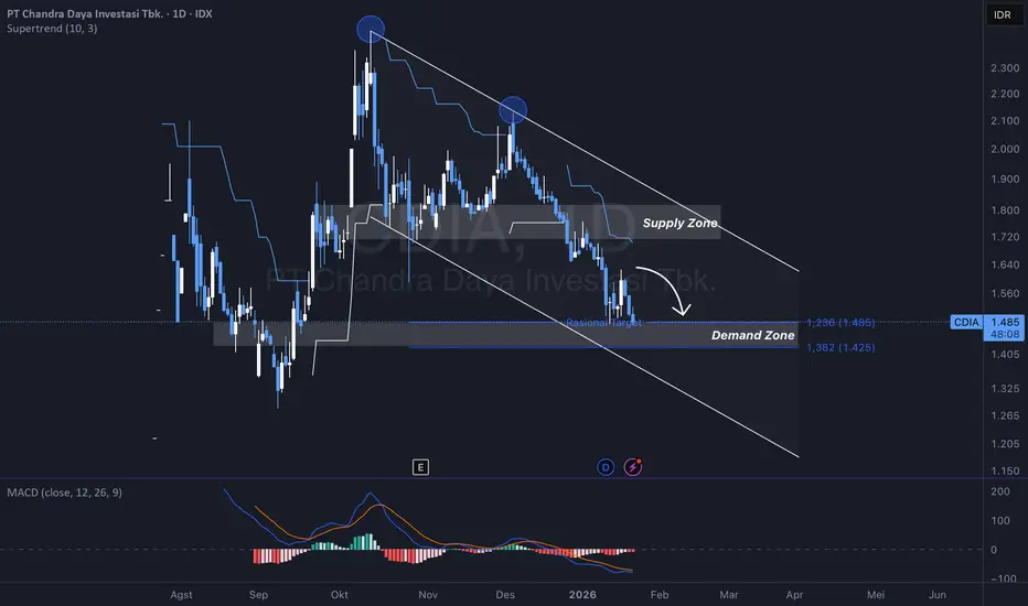 • Supertrend: Garis Supertrend saat ini berada di atas harga (berwarna merah), menandakan bahwa secara sistem tren, CDIA masih dalam status Sell atau Downtrend jangka pendek hingga menengah.