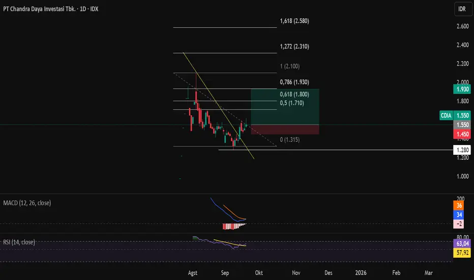 CDIA hari jumat 19 September 2025 berhasil breakout dari downtrend line (garis kuning), ini sinyal awal potensi pembalikan arah (reversal). MACD mulai membentuk momentum bullish, ditandai dengan merah di histogram mulai kecil. RSI sudah di atas 50 dan golden cross.