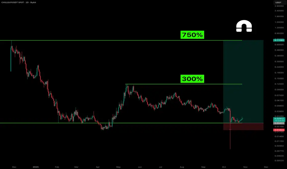 CHILLGUY looks like it’s finally waking up from a brutal downtrend. After months of heavy selling and an 85% drawdown over the past year, price has started forming a solid base around the $0.02 zone — a level that’s already been tested multiple times and held well. This kind of structure often hints at accumulation before a potential trend shift.