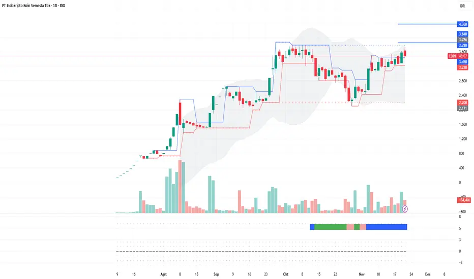 COIN saat ini sedang berkonsolidasi di area resisten 3450 dan sedang menguji area swing high 3780. Jika level ini berhasil ditembus dan bertahan di atasnya, ada potensi COIN untuk bergerak naik lebih tinggi menuju 4360 dengan minor target di 3840. Support yang terus naik membentuk anak tangga menunjukan adanya dominasi buyer di saham ini.
