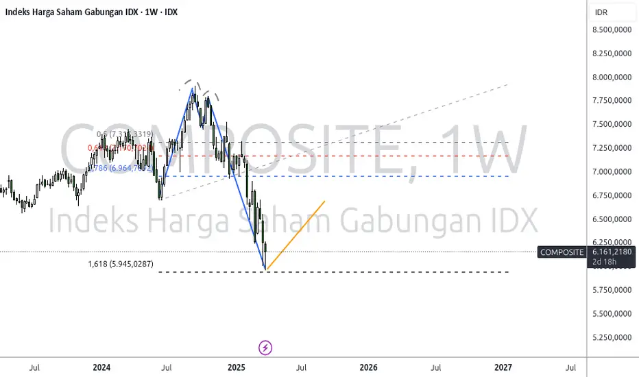 Index JKSE Pada timefrime weekly membentuk pola Double Top yang membuat harga semakin melemah. pada pergerakan harga terakhir memasuki area fibonacci retracement yang paling rendah 1.618. maka dari itu Index JKSE berpotensi untuk menguat terbatas ke area resistance.