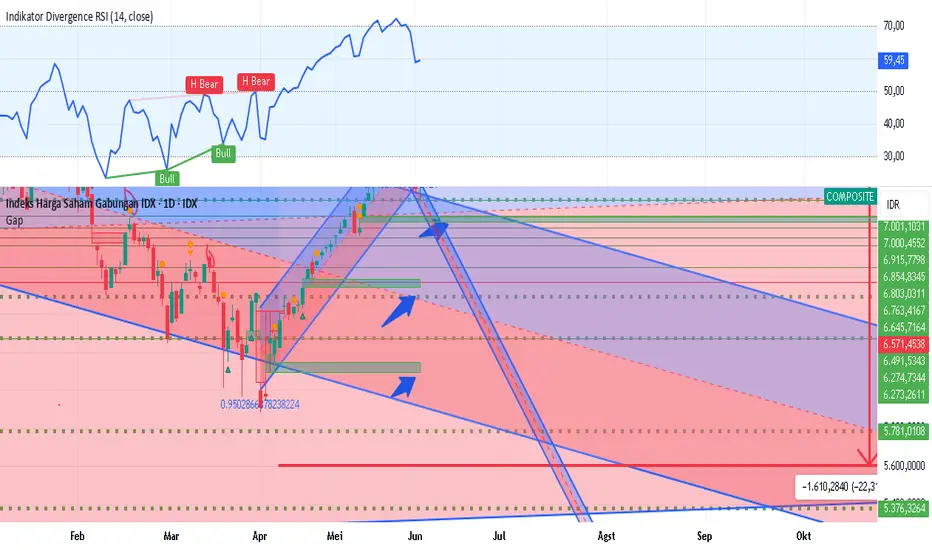IHSG berpeluang Tutup GAP 6800-6500-600,secara dayli dan ini bisa terjadi jika beberap sentimen global kembali di lancarkan dan sentimen news lokal ekonomi kembali di gaungkan oleh media lokal,tetapi dalam beberap minggu ini kembali IDR-USD menguat ke harga YoY yang mana hal ini memungkin kan IHSG bisa tertahan di 6000-6500 dalam waktu 2- 3 bulan kedepan,tunngu suku bunga the fed ,Initial jobless cliams US ,dan semacamnya ,palagi pajak ekspot import China US yang akan kembali di beritakan pada 2-3 bulan ke depan.jadi sediakan uang cash bagi investor dengan pespekstif kenaikan harga emas saat ini ,di 2020-2021 sata harga emas turun IHSG perlahan naik dengan puncak di akhir 2022,tetntu saja hal ini akan terulang kembali bisa di prediksi tapi dengan waktu yang tak terprediksi,harga emas tidak akan turun pernah turrun dari harga terendah tahun tahun sebelumnya,jadicah is the king sampai akhir tahun ,karana sentimen lokal yang paling kuat sudah lewat yaitu musim dividen.tapi jika dalam beberapa bualn dollar bisa menguat institusi asing akan kembali balik ke IHSG ,ada beberap news paling menarik dengan bond USA yang di ramalkan akan turun tapi dengan yield yang naik di karenakan ada nya pelemehan ekonomi amerika saat ini,