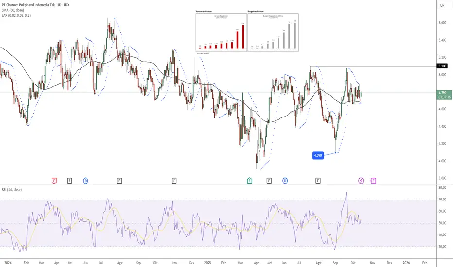 Pergerakan Sideways (atau turun) dari sejak akhir September 2025 menurut kami membentuk Bullish Continuation Pattern sehingga kenaikan dari sejak awal September 2025 (dari level Rp4,000an) masih akan berlanjut.