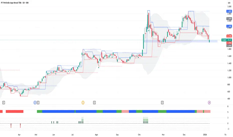 1. CUAN terus terkoreksi dan menembus support fraktalnya.